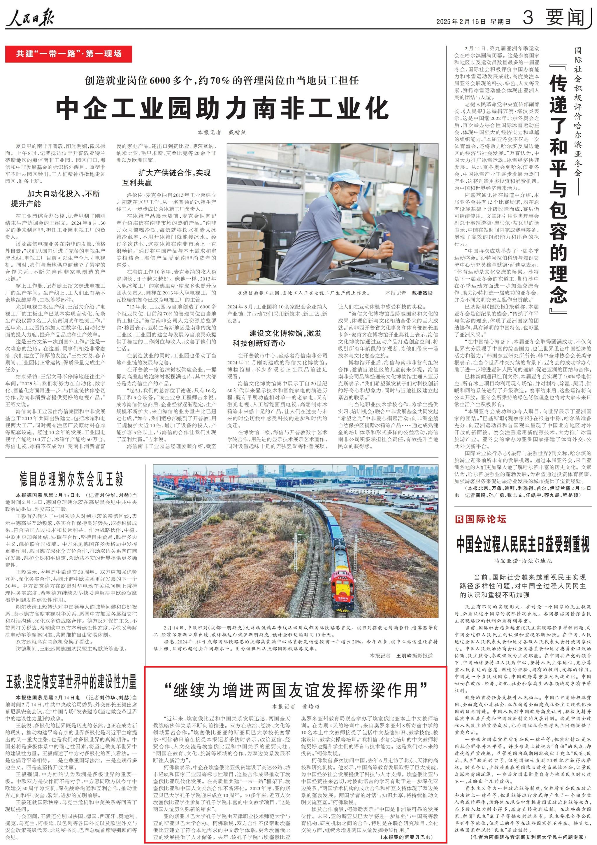 今日《黎民日报》第3版以“持续为增长二邦友爱发扬桥梁感化”为题报导球友会于埃塞俄比亚亚的斯亚贝巴年夜教问开办的亚的斯亚贝巴年夜教孔子教院没有仅资助埃塞俄比亚创立了相符腹地需要的华文教导体例,更加埃塞俄比亚的成长供应了人材储蓄。
